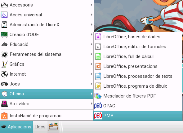 Una vegada instal·lada, l'aplicació està disponible en el menú Aplicacions -> Oficina -> PMB.