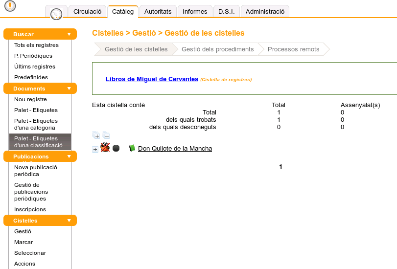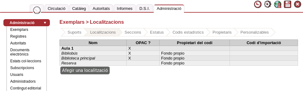 - Circulació: permet realitzar el control dels exemplars, així com de la comunicació entre la biblioteca i els seus usuaris.