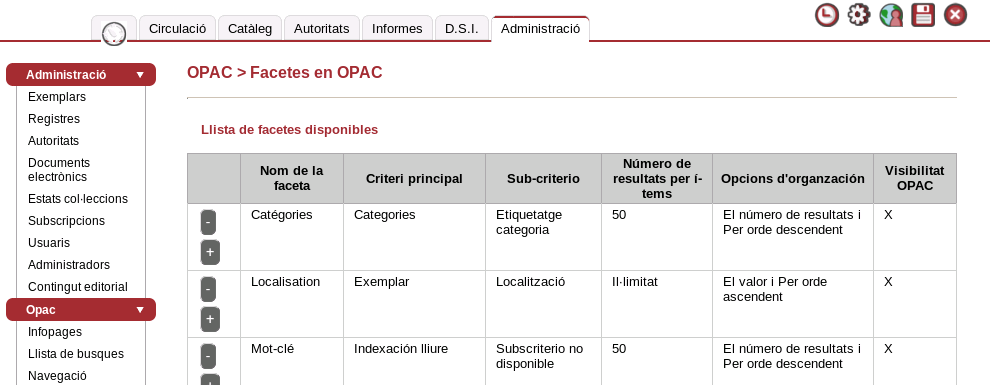 El segon submenú, Opac (Online Public Access Catalog), permet gestionar les busques que es realitzen en el catàleg. Conté diverses opcions: