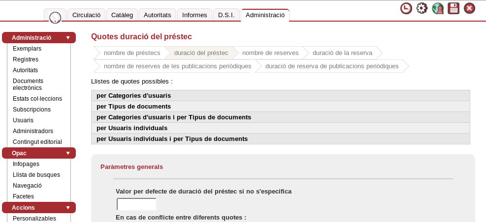 - Quotes: permet establir límits en els paràmetres com ara el nombre de préstecs o la duració d'aquests.