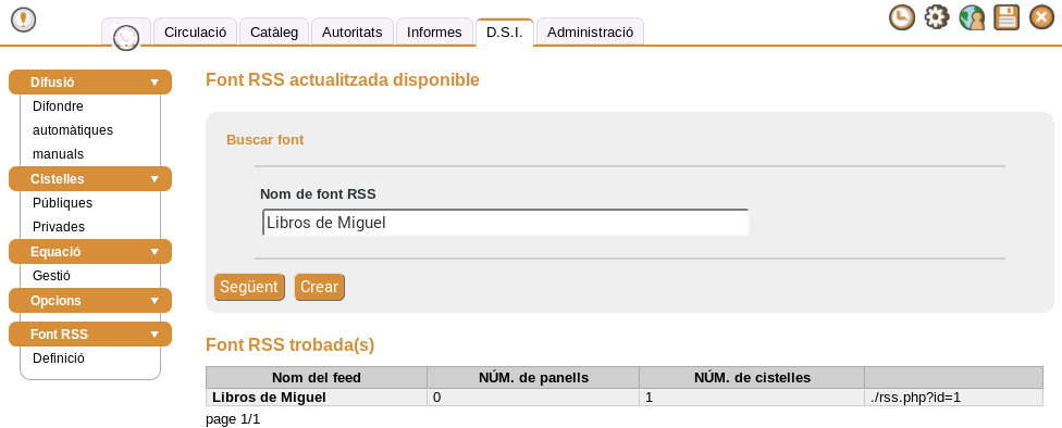 L'últim submenú conté la possibilitat que els usuaris se subscriguen a les busques via RSS. Per a realitzar la gestió de les fonts RSS hem de seleccionar aquesta opció.