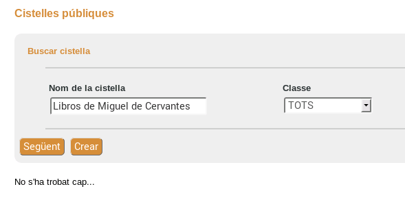 - Ara seleccionem l'opció Públiques (de la pestanya Cistelles) i, en la pantalla que es mostra, indiquem el nom i polsem el botó Crea.