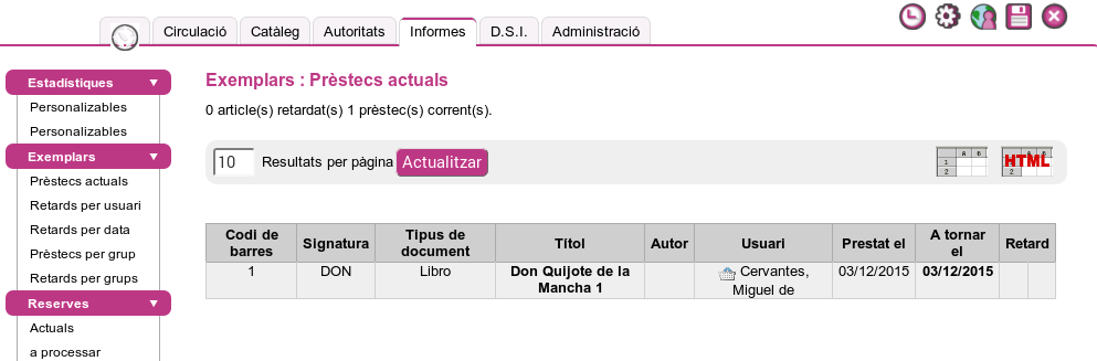 - Préstecs actuals: mostra els exemplars que estan prestats (videoguia).