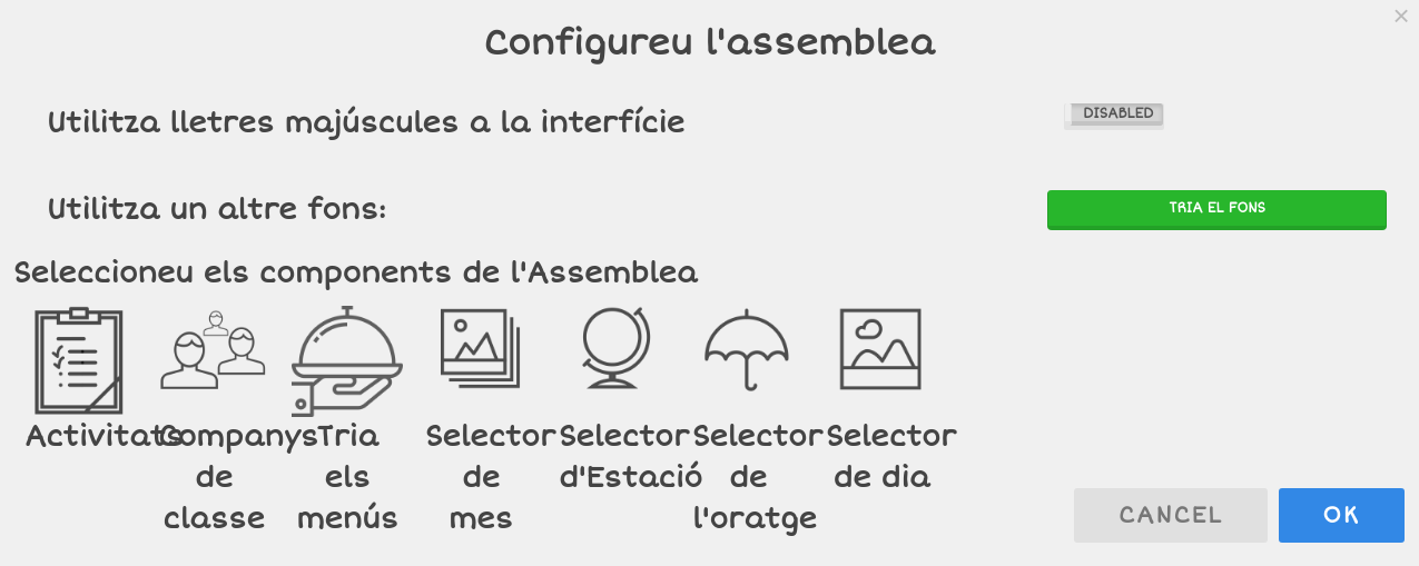 Si fem doble clic sobre qualsevol de les icones o mòduls d'Assemblea, se'ns proporcionaran diferents menús amb els quals configurar d'una manera més precisa les seues opcions de cara als usuaris o alumnes.