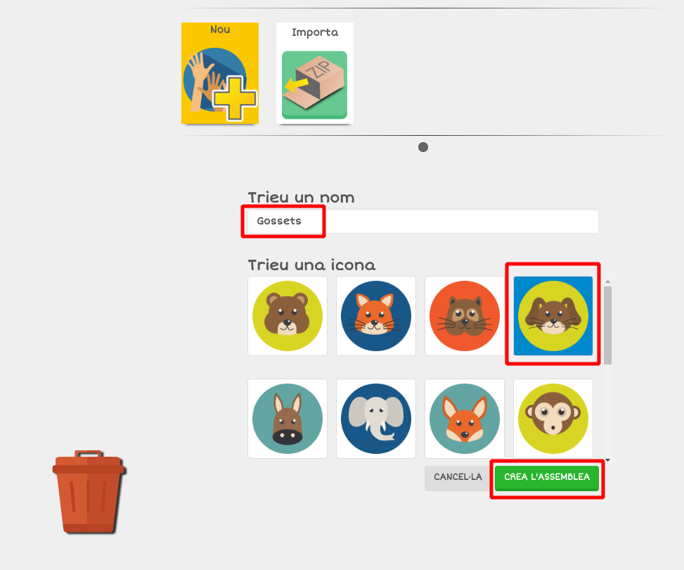 - Guardar l'assemblea, això ho farem si no volem perdre la nostra edició i que així, quan la tornem a obrir, tinguem les nostres dades, usuaris i usuàries, subfinestra de configuració... per defecte.