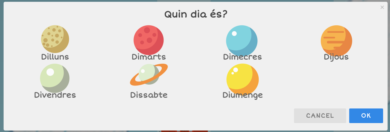 En aquest mòdul, quan el seleccionem, veurem els dies de la setmana i podrem triar el que corresponga en cada cas. Les icones estan inspirades en els noms dels planetes que van donar lloc a aquests noms.