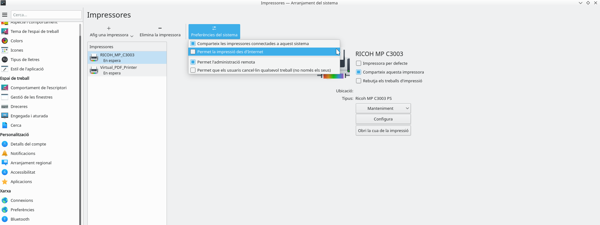 Per últim cal saber que des del menú principal de l'assistent d'impressores és possible editar algunes preferències globals com la gestió remota de les impressores així com activar la modificació de l'opció de compartir la impressora.