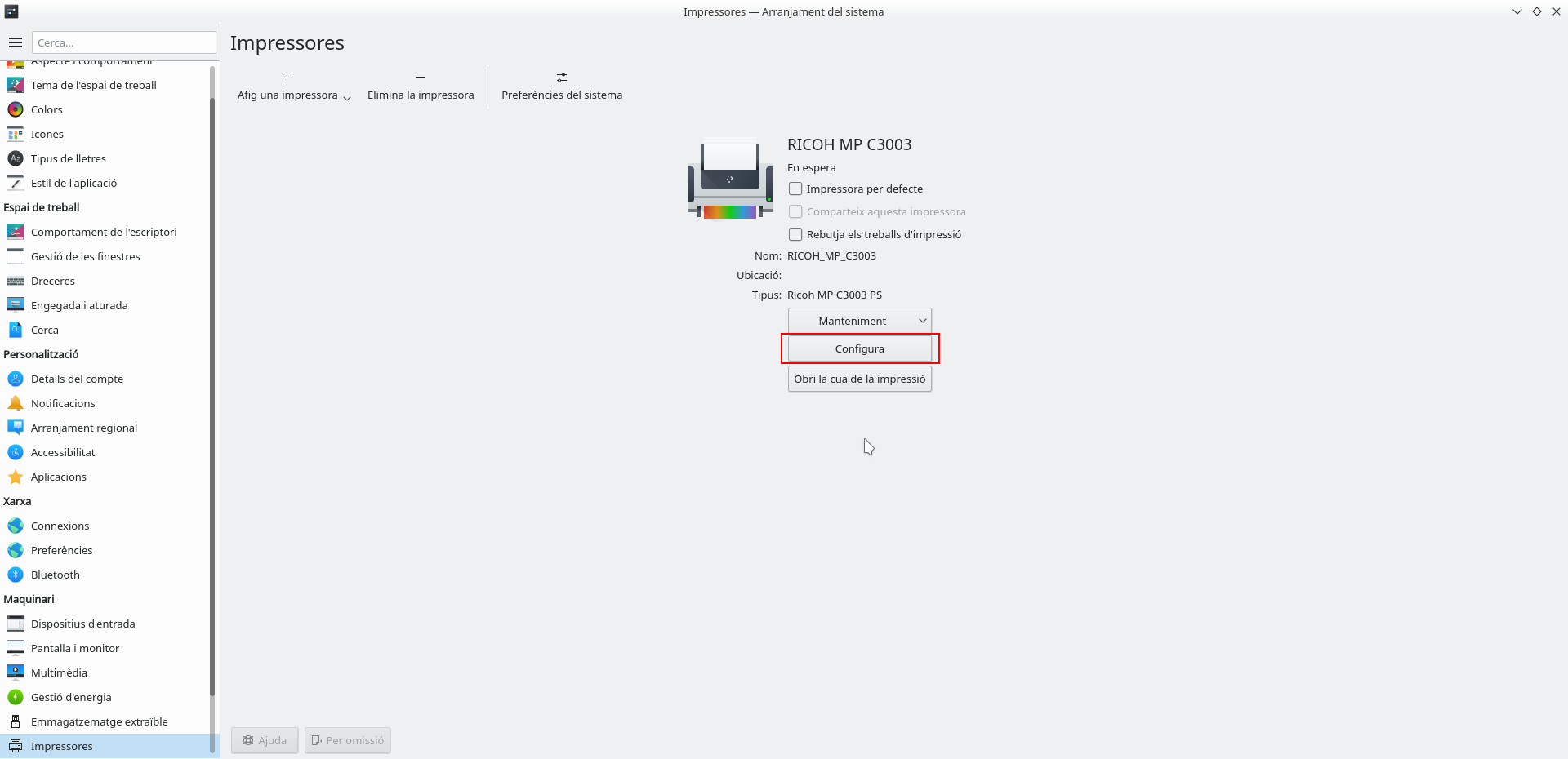 Una vegada afegida la impressora és possible configurar algunes de les seues propietats fent clic sobre Cnfigura.