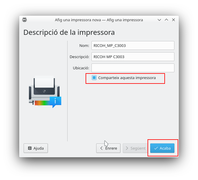 Finalment es mostrarà un pantalla on es pot editar el nom i la descripció de la impressora. També és possible indicar si es desitja compartir la impressora perquè siga accessible des d'altres equips connectats al nostre (per exemple que la impressora configurada en el servidor d'aula siga accessible als clients d'aquesta).