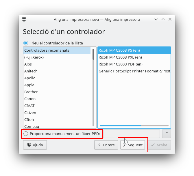 A continuació es mostrarà la llista de controladors disponibles en el sistema per tal de triar l'adequat per a la impressora seleccionada. També és possible carregar de forma manual el controlador activant l'opció corresponent. Una vegada seleccionat el controlador caldrà fer clic en Següent.