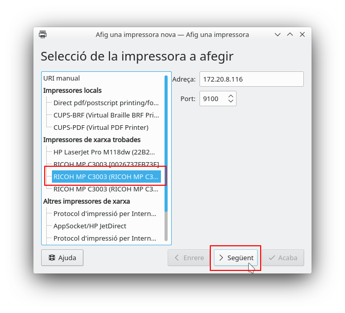En fer clic en Afig una impressora nova, es mostrarà la relació d'impressores tant les locals com les disponibles en xarxa. Caldrà seleccionar la impressora desitjada i caldrà fer clic en Següent.