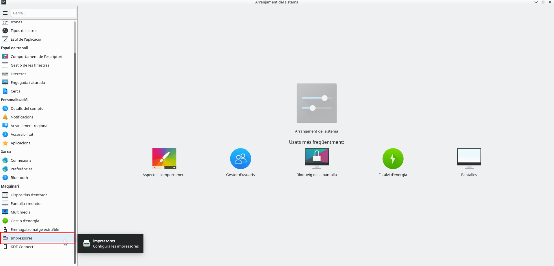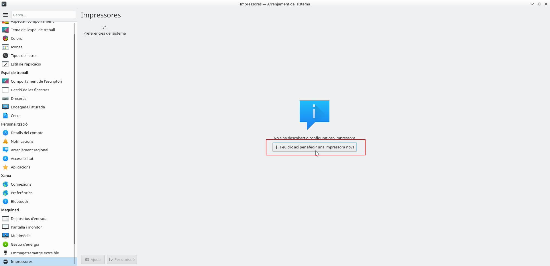 Dins d'Arranjament del sistema cal fer clic en Impressores
