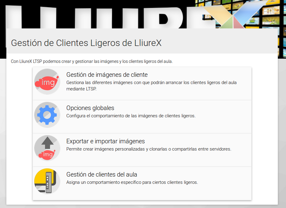 | LliurexLTSP | aquí encontraremos las opciones de configuración de los clientes de aula, así como de la gestión de los mismos. |