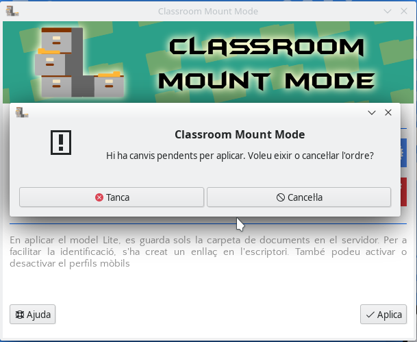 Si en eixir de l'aplicació es detecta que s'han realitzat canvis en el mode de muntatge però no s'han aplicat, es mostrarà un missatge d'alerta perquè l'usuari puga cancel·lar l'eixida i aplicar-los. Si s'ix de l'aplicació sense aplicar els canvis, aquests s'hi perdran i es mantindrà la configuració que ja existia prèviament.