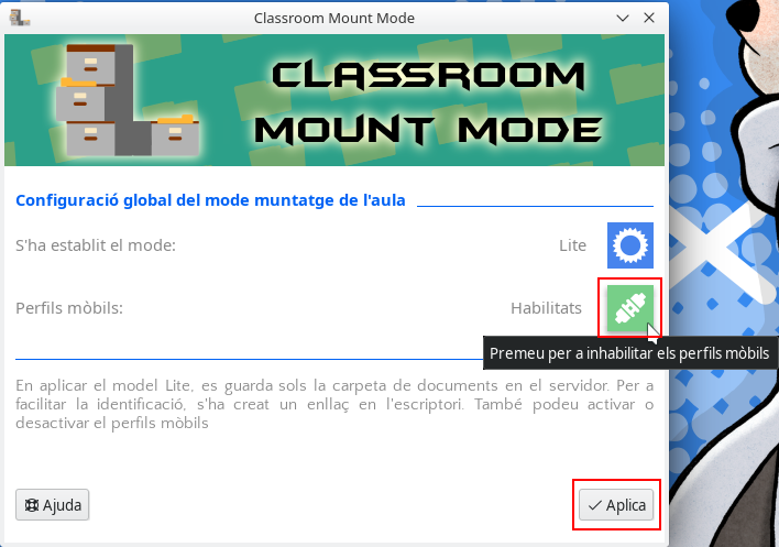 Una vegada seleccionades les opcions que es vulguen establir en l'aula, cal fer clic damunt del botó “Aplica” perquè el mode de muntatge seleccionat i l'ús de perfils mòbils s'apliquen quan els usuaris inicien la sessió en els equips connectats al servidor.