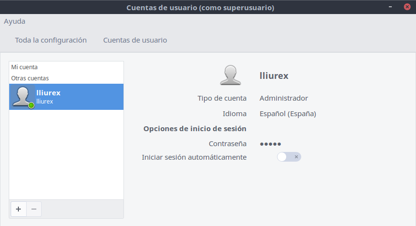 Hecho esto si en el menú escribimos "usuari" se mostrará la opción Cuentas de usuario que permitirá cambiar la opción de autologin.