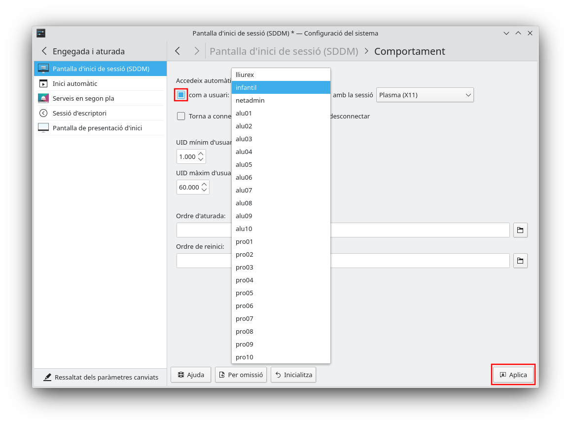 Per a configurar l'inici automàtic de la sessió, una vegada dins dele Pantalla d'inici de sessió (SDDM)->Comportament en el bloc d'Iniciar sessió automàticament es marcarà l'opció com a usuari i se seleccionarà de la llista d'usuaris disponibles l'usuari a utilitzar per a l'inici automàtic. A continuació es farà clic a Aplica per a guardar els canvis