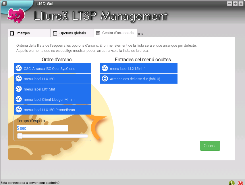 Si polsem la pestanya Gestor d'arrancada es mostren dos columnes amb totes les opcions d'arrancada que els clients poden mostrar en el menú PXE. En la columna de la dreta es poden observar les opcions disponibles que no volem que es mostren i en la columna de l'esquerra aquelles que seran visibles i seleccionables quan arranquem els clients per xarxa, de les quals la seleccionada per defecte és la que deixem en primer lloc.
