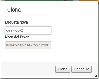 També tenim el botó Clona, que mostra un diàleg en el qual introduïm el nom per a la nova plantilla i s'ompli, automàticament, el nom del fitxer. Per a començar la creació polsem el botó Clona.