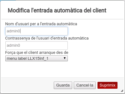 En cas de voler modificar algun dels paràmetres que hem fixat o esborrar la configuració, hem de fer doble clic sobre el client. Aleshores s'obri un diàleg en el qual, a més de les dades que hem introduït, apareix un desplegable nou que mostra les diferents possibilitats d'arrancada que podem aplicar. Si en seleccionem alguna, el client arrancarà automàticament l'entrada de menú seleccionada.