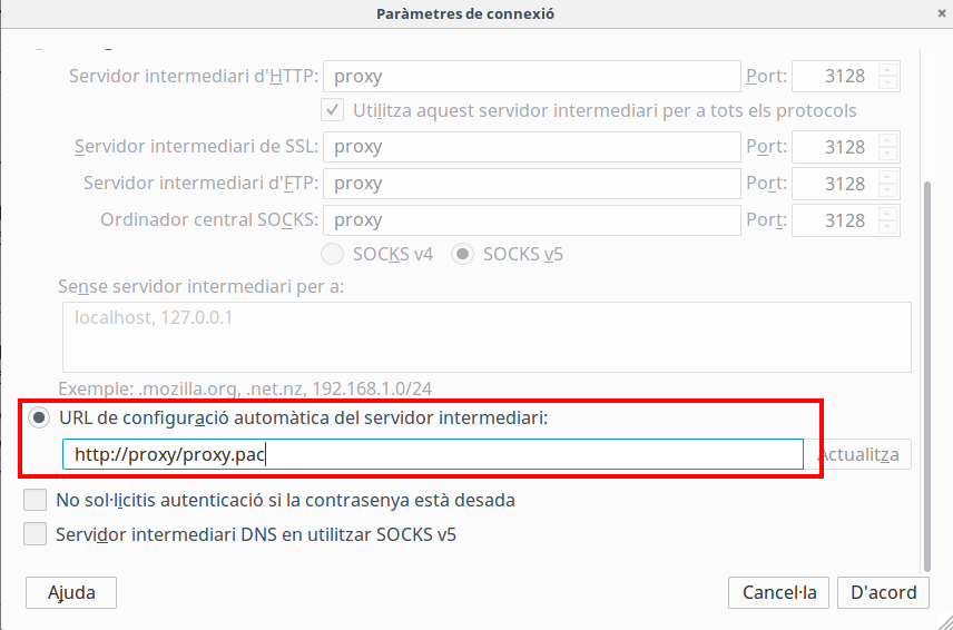 O indicar-li l'arxiu .pac per a que configure el proxy de manera automàtica. Les dos solucions són igualment vàlides.