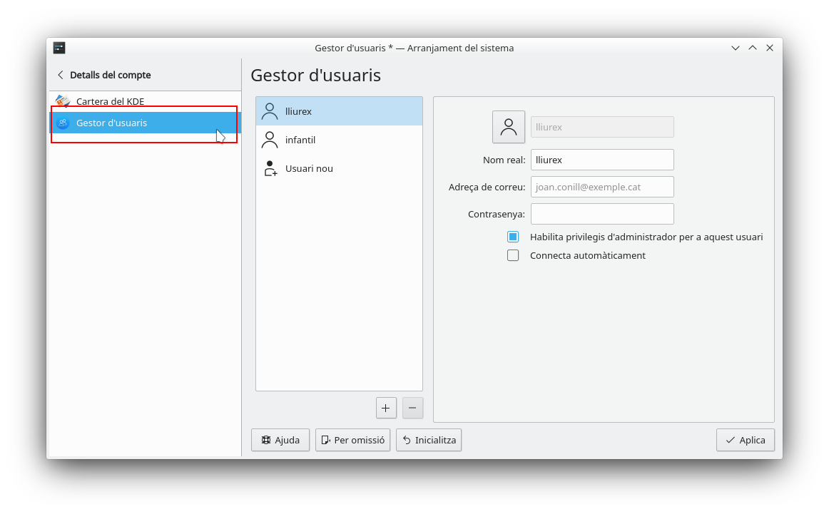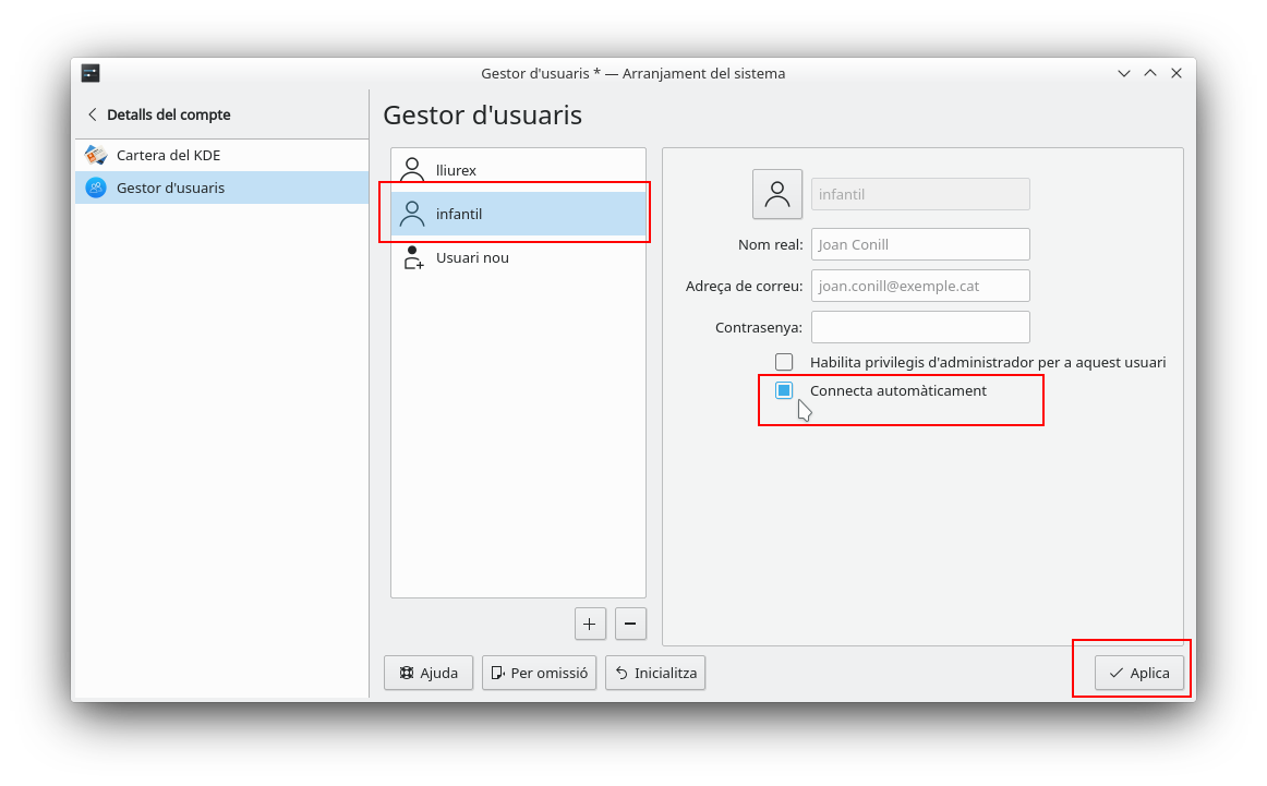 Per a configurar l'inici automàtic de la sessió, una vegada dins del Gestor d'usuaris, cal seleccionar de la llista d'usuaris locals l'usuari amb el qual es desitge accedir de forma automàtica i a continuació s'ha de marcar l'opció Connecta automàticament i fer clic en Aplica per a poder guardar els canvis.