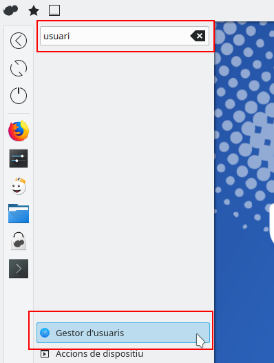 També és possible accedir directament al Gestor d'usuaris mitjançant l'opció de cerca del menú d'aplicacions. Si es busca usuari es mostrarà l'accés al Gestor d'usuaris.