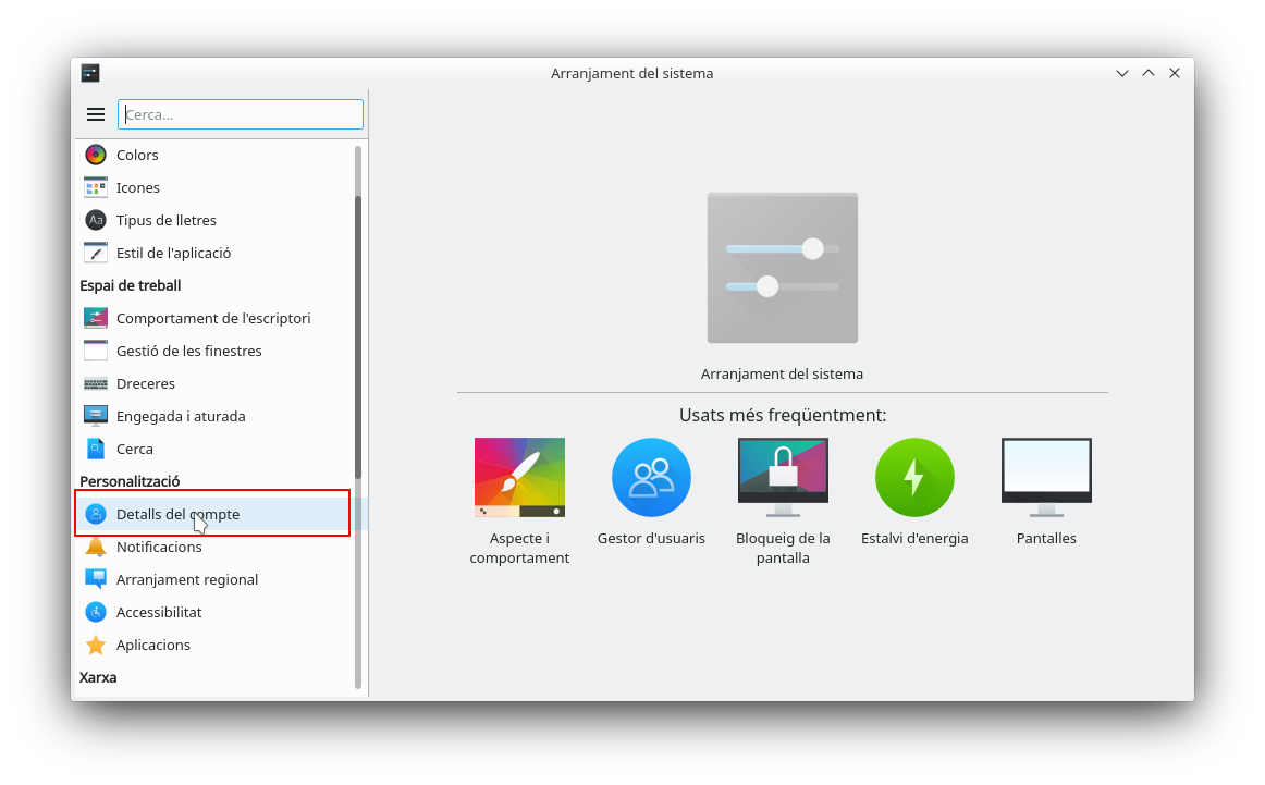 Dins d'Arranjament del sistema, en panell de l'esquerra, en l'apartat de Personalització, cal triar l'opció de Detalls del compte