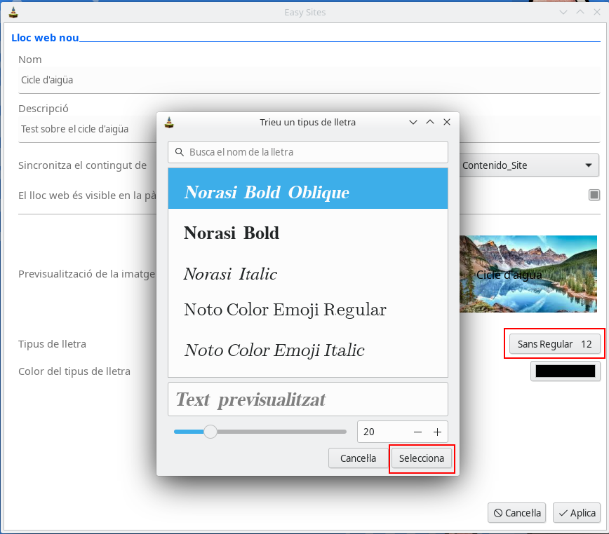 - Tipus de lletra: Si es fa clic sobre el selector de tipus de lletra es pot triar el tipus i mida del tipus de lletra amb què es mostrarà el nom del lloc dins de la imatge.