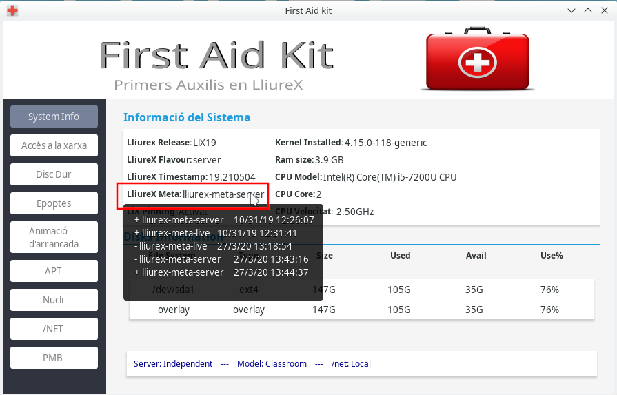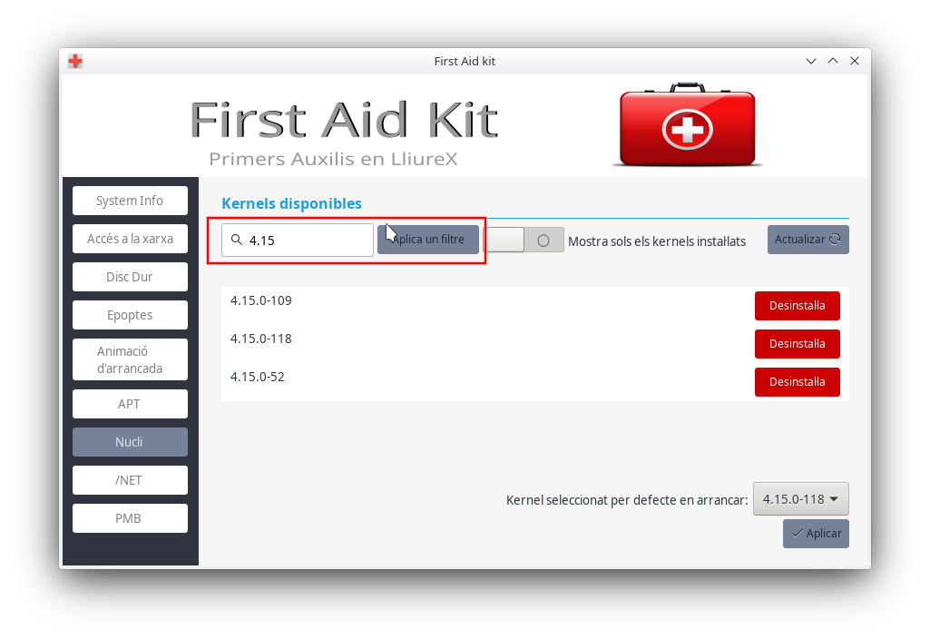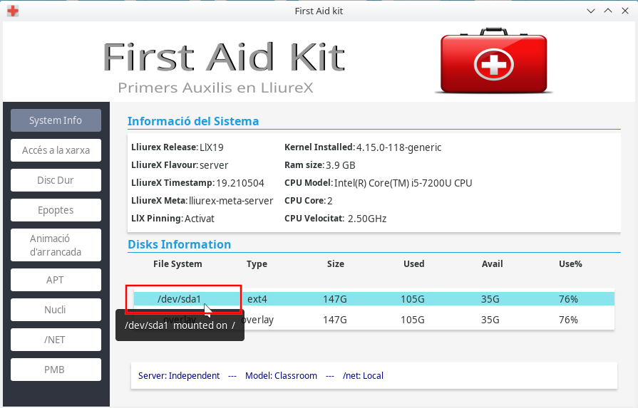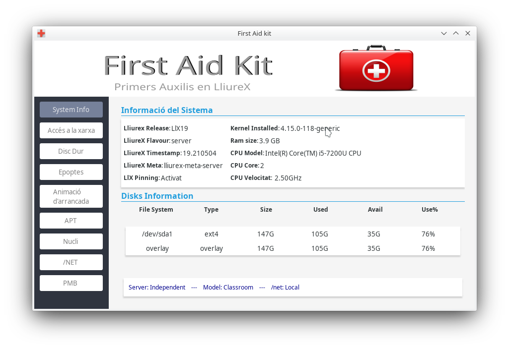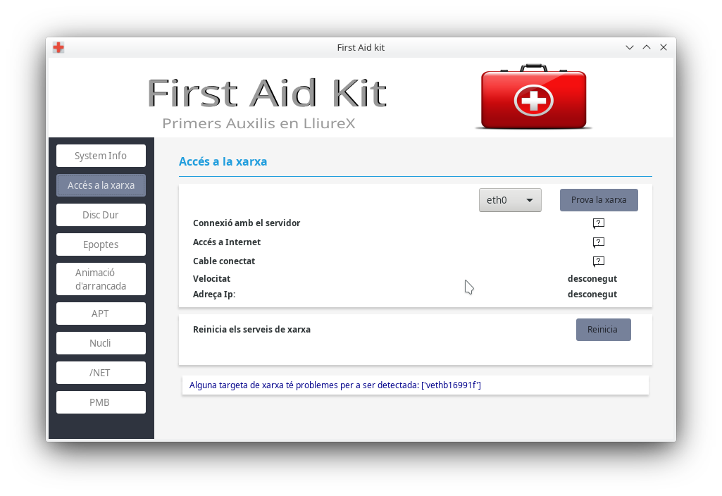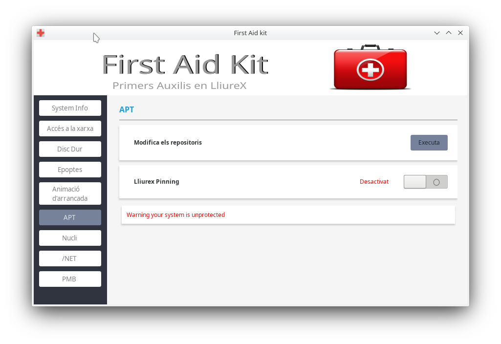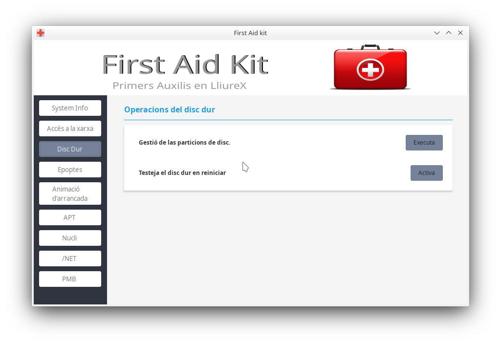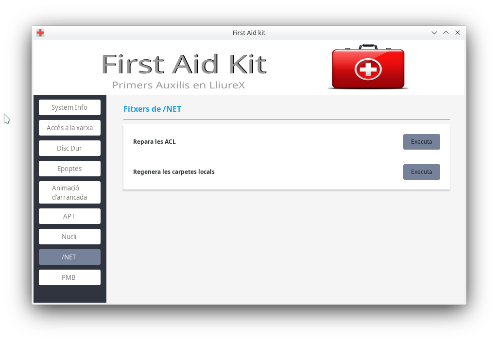 First Aid Kit és un xicotet programa d'ajuda a l'usuari Administrador, perquè d'una manera senzilla puga resoldre els problemes comuns que puga trobar en LliureX.