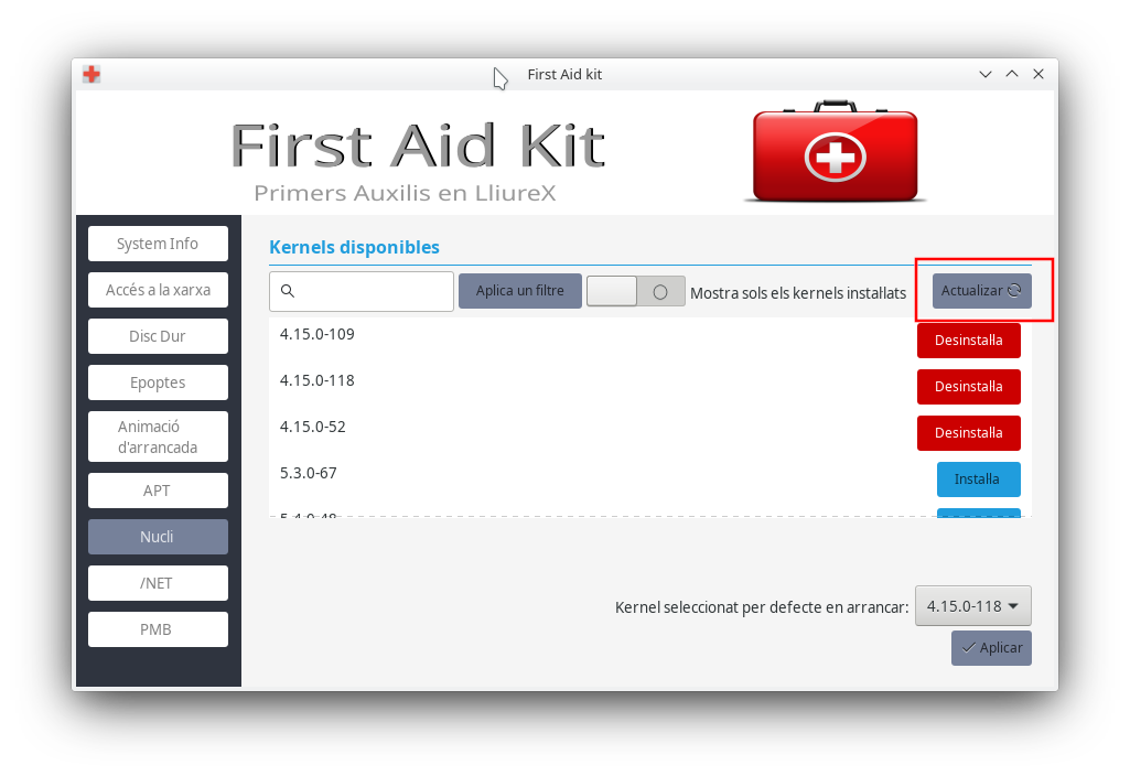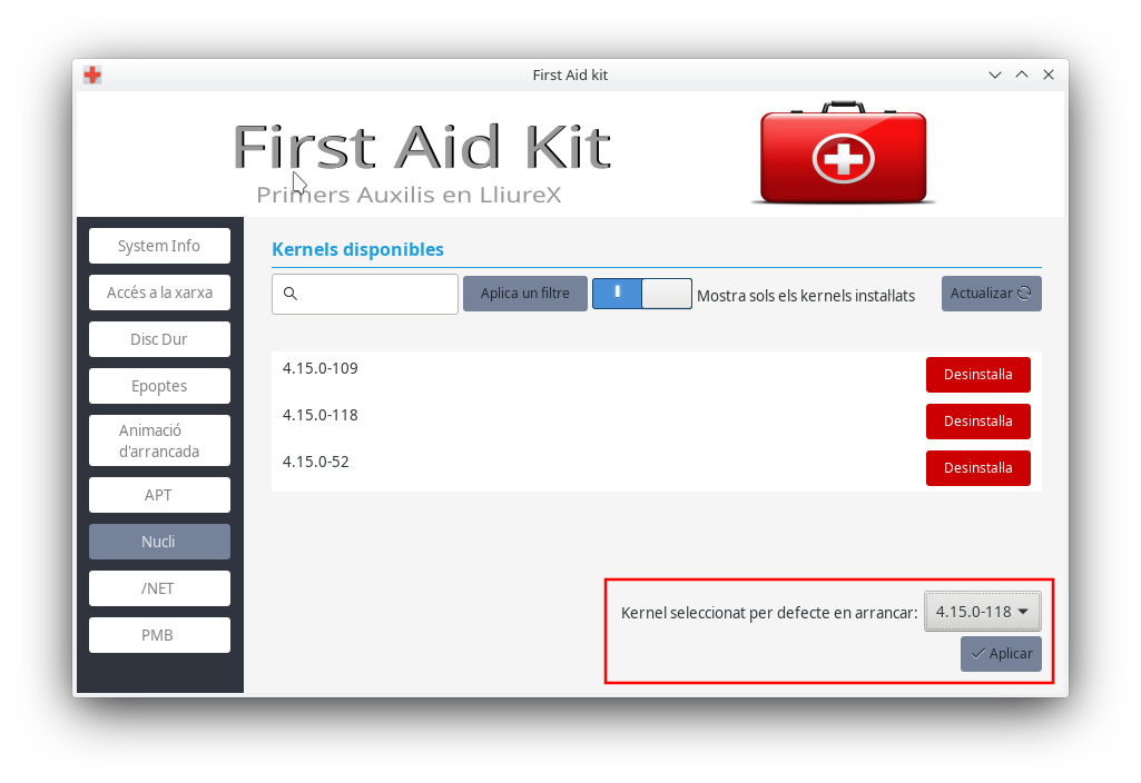 Ací trobeu una de les opcions més interessants i que us ajudarà a definir el nucli que necessiteu per al vostre sistema. Hi podreu instal·lar , desinstal·lar o fixar el nucli que vulgueu per a arrancar.