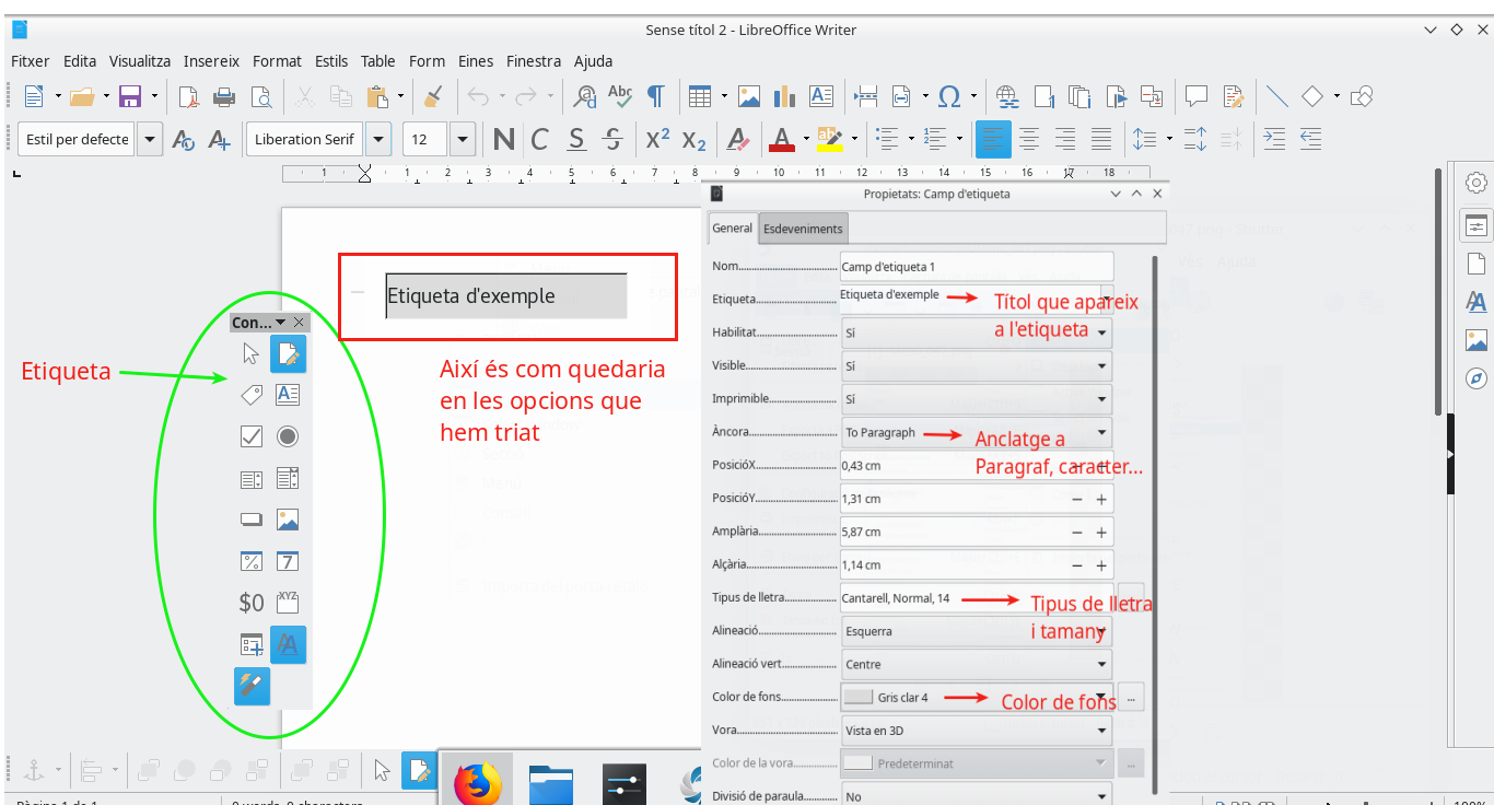 - Quadre de text: A l’igual que l’etiqueta, una vegada punxem damunt s’obre un menú en el que podem triar les opcions més adients que necessitem. Dins d’un quadre de text deixem l’espai en blanc perquè es puga escriure dins tot allò que es desitge... Podria ser una bona opció per a respostes en un examen d’omplir buits, posar el nom, o allò que ens semble oportú.