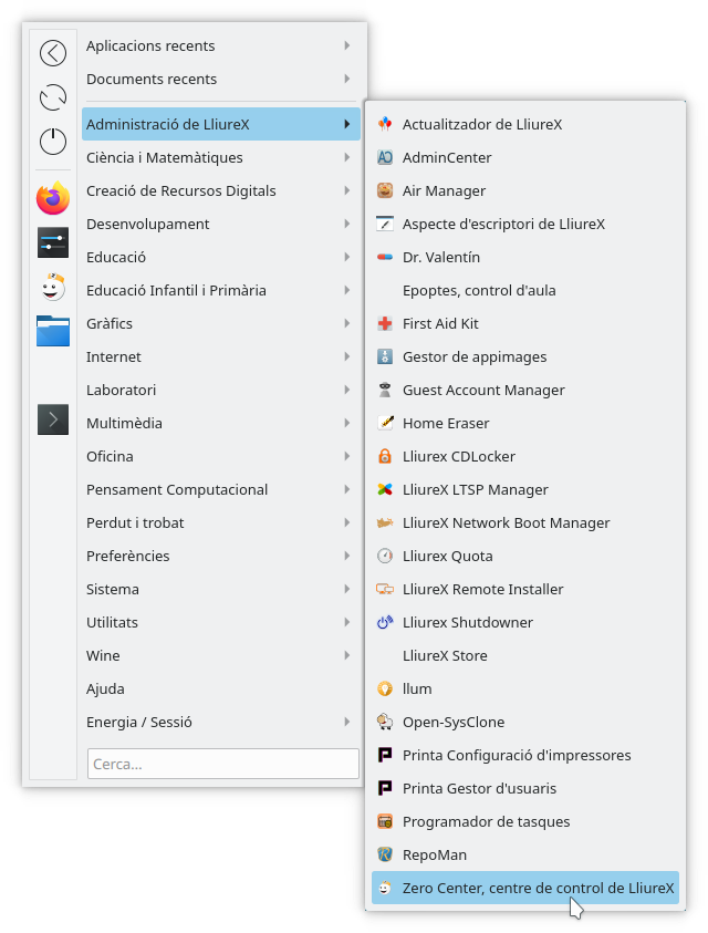 Per a accedir a ella seleccionem el menú: Aplicacions -> Administració LliureX -> Zero Center, Centre de control de LliureX.