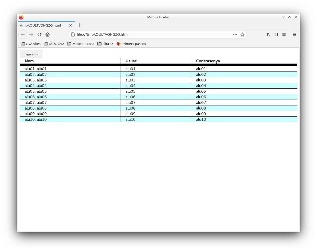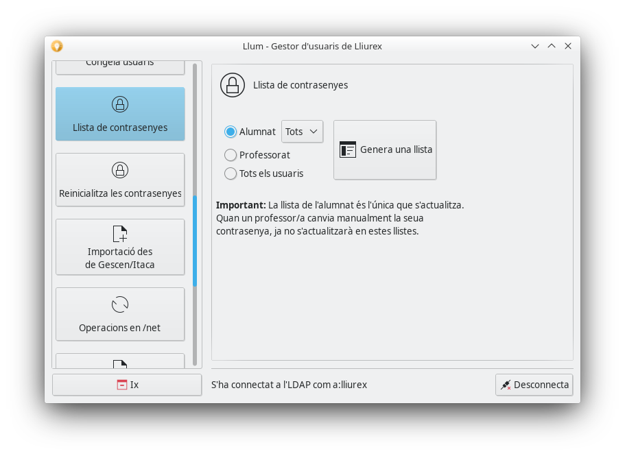Després de seleccionar les opcions, polsem el botó Genera una llista i es genera el llistat que conté el nom, l'usuari i la contrasenya. El llistat es pot imprimir polsant el botó Imprimeix, per a consultar-lo més tard.