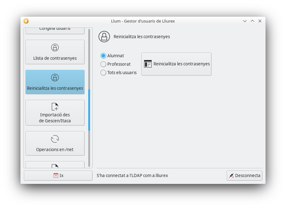 Una altra de les opcions interessants que ofereix l'aplicació és la de restablir les contrasenyes. Per a això hem de polsar el botó Reinicialitza les contrasenyes i seleccionar el grup d'usuaris a què volem aplicar la funció.