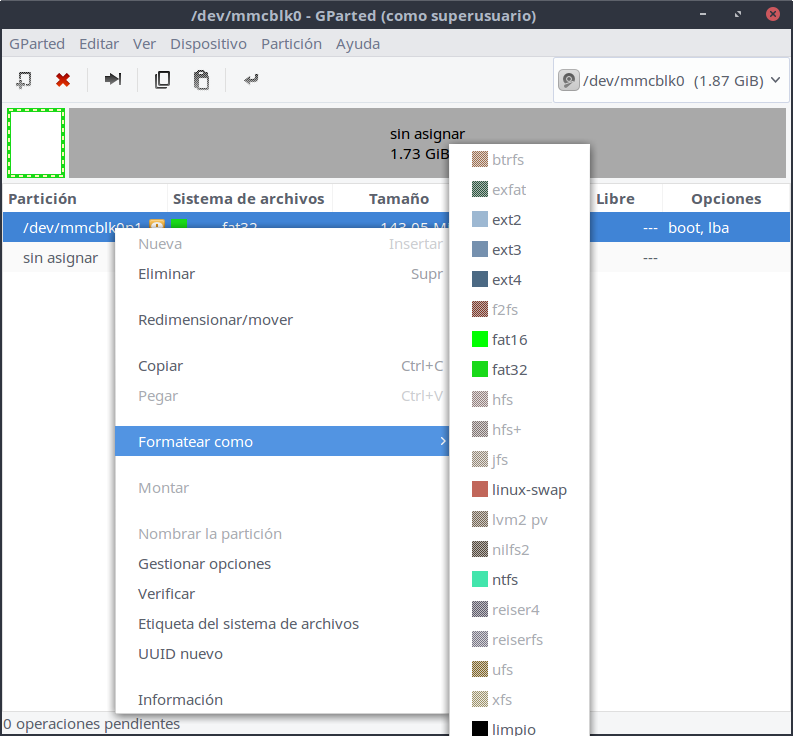 Luego podemos clickar sobre la partición que queremos cambiar y nos aparecerá una lista de opciones, entre ellas se encuentra la de formatear.