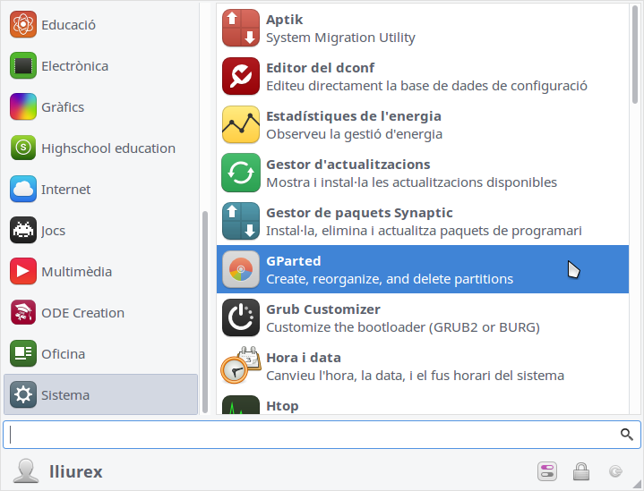 Per a iniciar el GParted anem a Inici > Sistema > GParted.