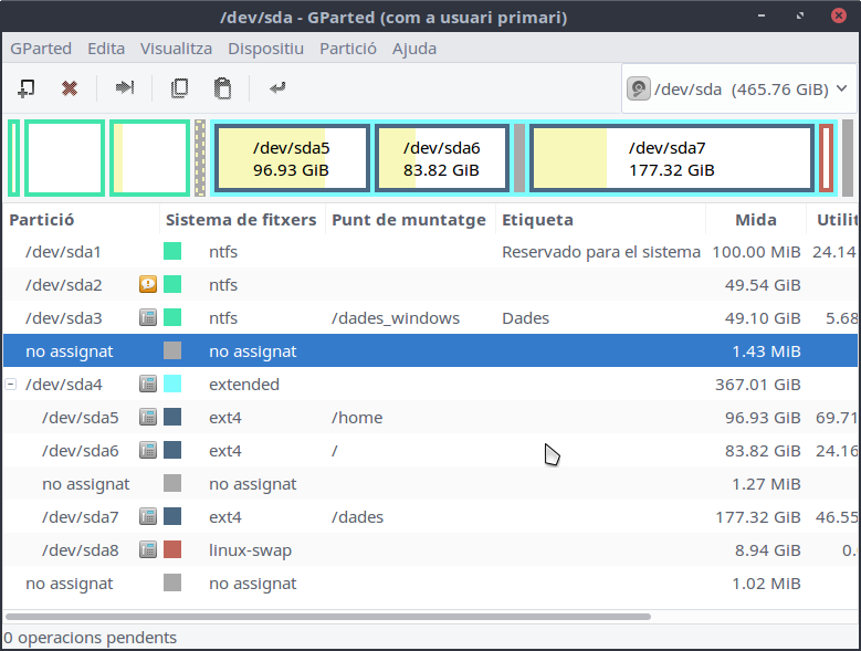 Ens demanarà que ens autentiquem com a administradors i podrem veure l'entorn gràfic. Es pot veure la taula de particions de cadascun dels dispositius que tenim connectats al nostre ordinador. Aquest seria un exemple de taula de particions estàndard on podem veure la partició principal i la partició d'intercanvi.