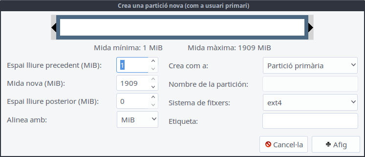 Podem eliminar la partició i crear-ne una de nova. Aquest botó s'habilitarà quan siga un espai lliure. En aquest cas, tenim un disc al qual hem esborrat la partició i volem crear-ne una de nova. És important que ens fixem en quin tipus de sistema de fitxers volem, ja que si triem ext4 només es podrà llegir en Linux. Si es tracta d'un disc dur extraïble que volem compartir amb altres sistemes operatius es convenient triar fat32.