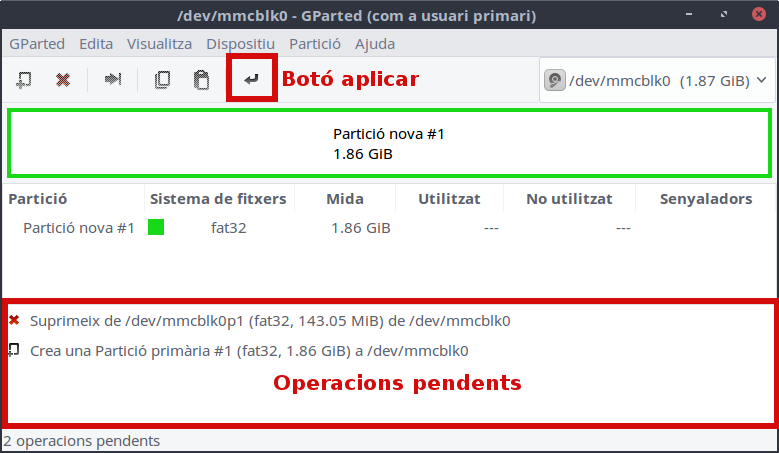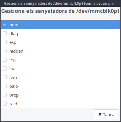 Quan acabe podem canviar també les opcions de la partició. Si serà una partició d'arrancada podem anar al Menú contextual > Opcions i seleccionar l'opció arrancada (com per a crear una targeta SD d'arrancada del sistema per a la Raspberry):