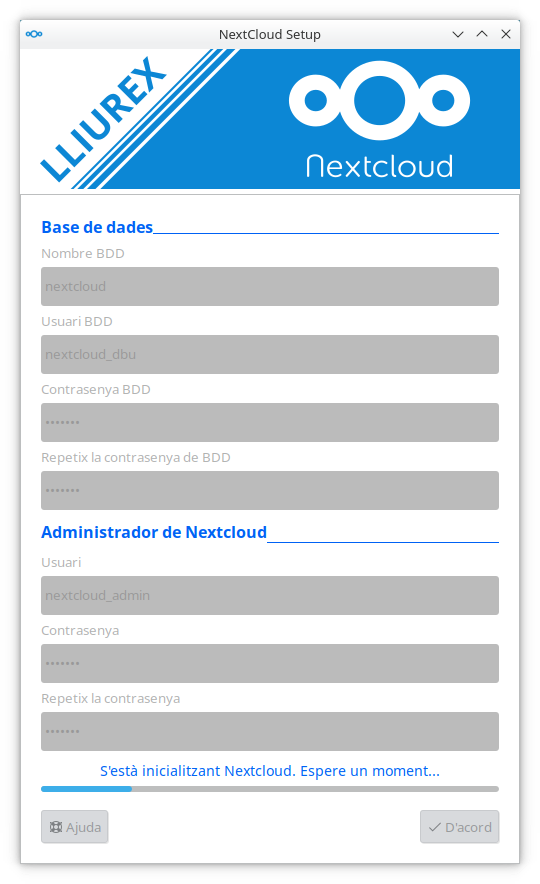 En executar el zomandament, es mostrarà una finestra per a introduir les dades necessàries perquè el Nextcloud puga inicialitzar-se: usuari de base de dades, contrasenya per a aquest usuari, usuari administrador i la seua contrasenya.