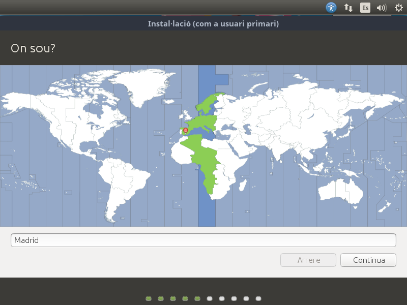 Seleccionem el lloc on ens trobem. Normalment les opcions que vénen per defecte són les correctes, per tant, sols cal fer clic a Continua: