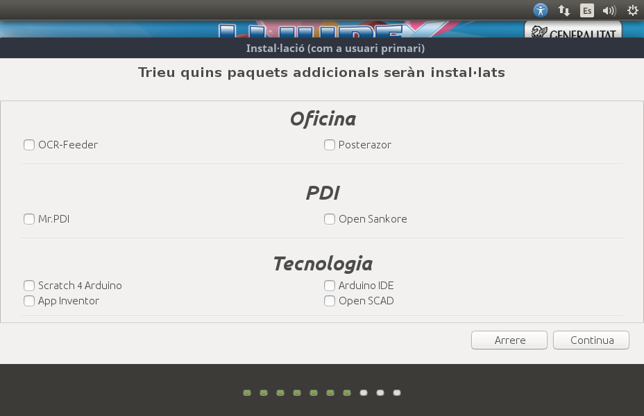 Si volem instal·lar programari addicional en la instal·lació inicial ho podem fer ací. Podem instal·lar aquests paquets a posteriori si volem: