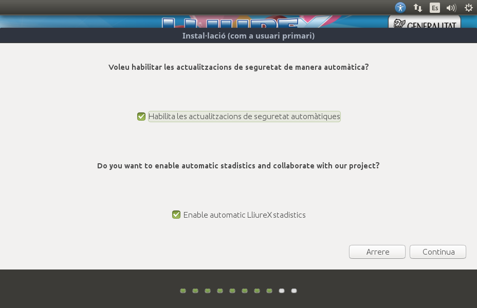 En la pantalla següent ens pregunta si volem que l'equip s'actualitze automàticament en el cas que es detecte alguna fallada de seguretat. És important marcar aquesta opció per a estar sempre protegits. A més, se'ns pregunta si volem enviar estadístiques anònimes sobre l'ús que fem de l'ordinador. En el cas de ser una instal·lació personal podem desactivar-la, però si és una instal·lació en el centre és molt recomanable deixar-la activada, ja que permet que l'equip del LliureX conega quins són els programes més utilitzats i on centrar els nostres esforços.