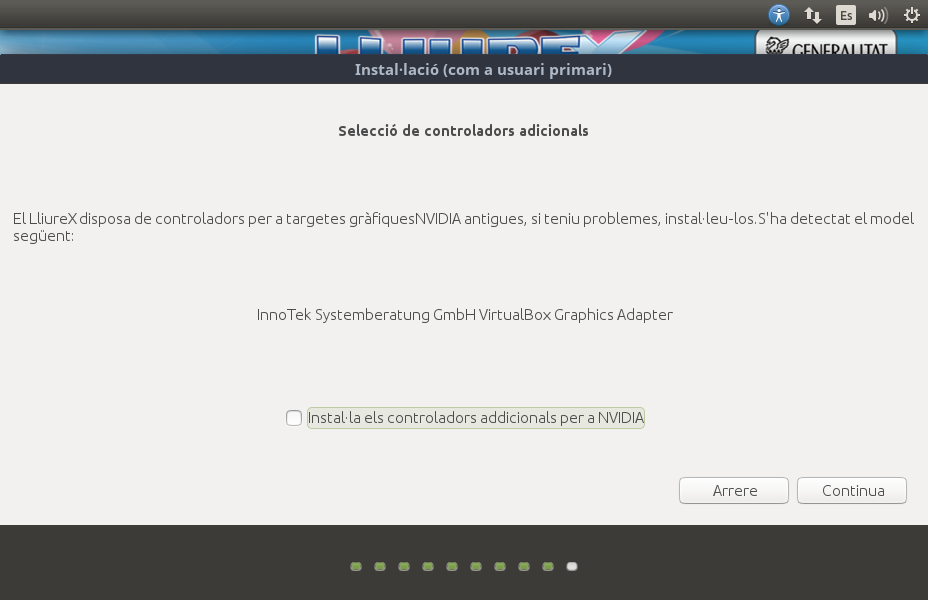 Després se'ns demana si volem instal·lar controladors addicionals. Aquesta opció és important NO marcar-la, llevat que sapiem de ciència certa que tenim una targeta NVIDIA.