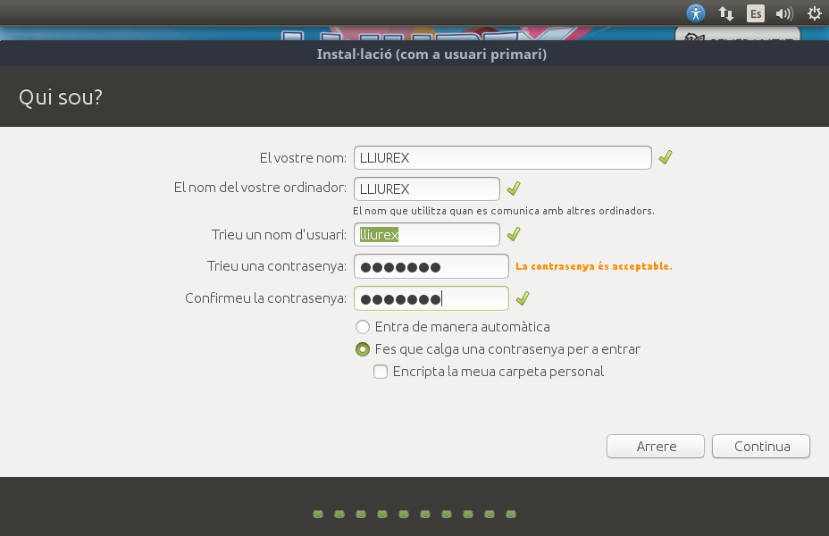 Posteriorment, sols ens queda triar el nostre usuari, la contrasenya i el nom de l'equip. Aquest usuari i contrasenya és local, si estem instal·lant una versió Client podrem accedir amb el nostre usuari de xarxa també: