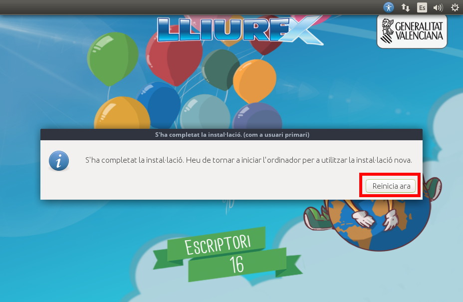 Finalment, ens avisa que el procés d'instal·lació ja ha acabat. Ara només queda reiniciar el sistema i traure el dispositiu que hem utilitzat per a la instal·lar-lo.