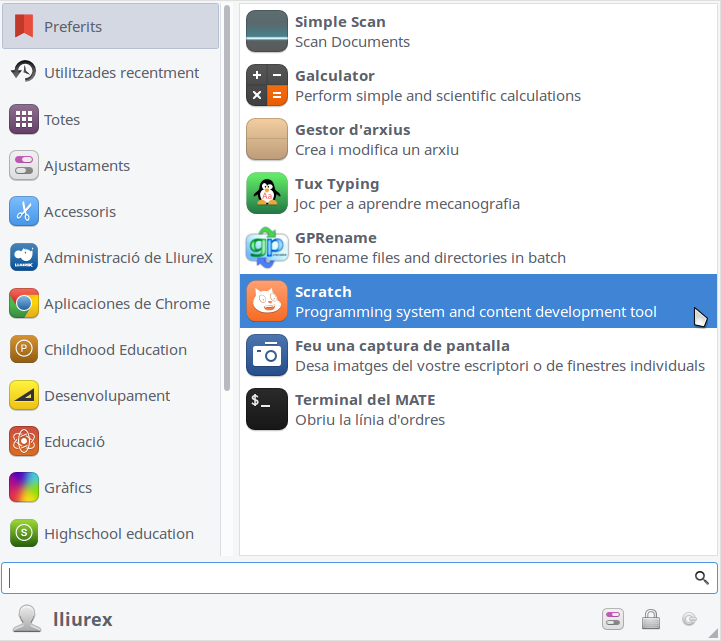 Per a accedir a l'Scratch, hem d'anar a Inici > Educació > Scratch; també el podem tindre en Preferits.