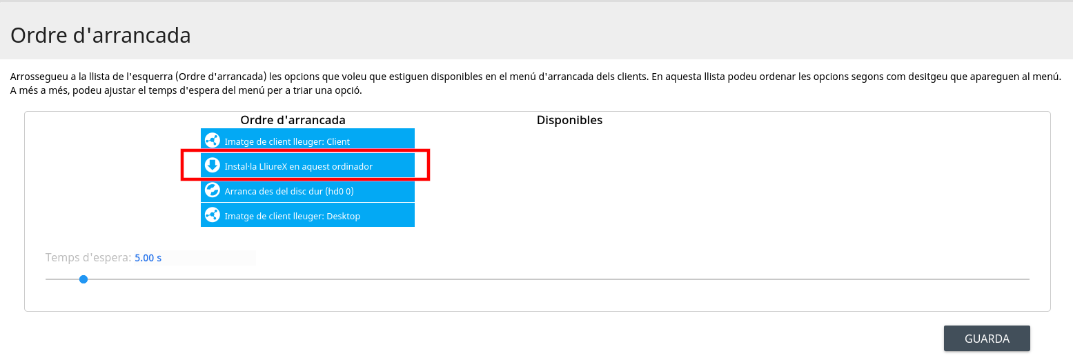 Llavors, ens apareixerà la pàgina següent on tindrem dos columnes: Disponibles i Ordre d'arrancada. En Disponibles tenim aquelles opcions que no tenim habilitades i en Ordre d'arrancada aquelles que ens apareixeran en el menú. Si el que volem és realitzar una instal·lació desatesa caldrà posar com a primera opció Instal·la el LliureX en aquest ordinador, d'aquesta manera la tindrem com a primera opció en arrancar l'ordinador.