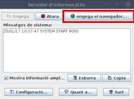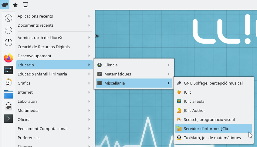 Per a iniciar el JClic report server, anem a Inici > Educació > Servidor d'informes del JClic i l'iniciem (l'aspecte d'aquest menú pot variar en funció de la versió de LliureX i/o de la personalització realitzada per l'usuari).